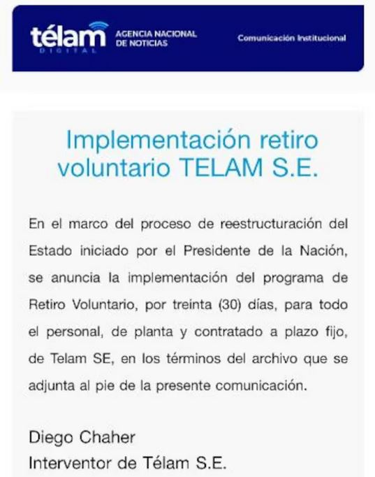 “En el marco del proceso de reestructuración del Estado iniciado por el Presidente de la Nación, se anuncia la implementación del programa de Retiro Voluntario, por treinta (30) días, para todo el personal, de planta y contratado a plazo fijo, de Télam S.E.”, sostiene el comunicado.