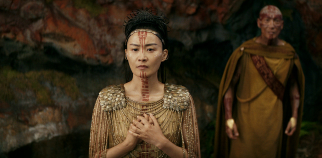 Tras una lucha en la que Kong se come en dos pancitos a un titán submarino y lo deglute cual salchicha, el macaco le presenta a su nuevo padre adoptivo una civilización de monos esclavizados, muy en línea de El planeta de los simios, que cumplen las órdenes del tirano Skar King, un orangután pelirrojo que domina al resto gracias al sometimiento de una especie de Godzilla hembra que escupe hielo llamada Shimo.