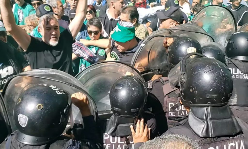 “No vamos a parar de luchar hasta quitarle la motosierra y que empiece a cortar otras cabezas, que no sean la de los trabajadores y jubilados”, sostuvo entre gritos y empujones el líder del gremio estatal, Rodolfo Aguiar.La situación generó una serie de embestidas por parte de los presentes en la protesta contra los efectivos de seguridad, para evitar que se los mantenga dentro de la traza de la vereda. Por el momento no hay reportes de heridos, pero la tensión sube en el lugar.