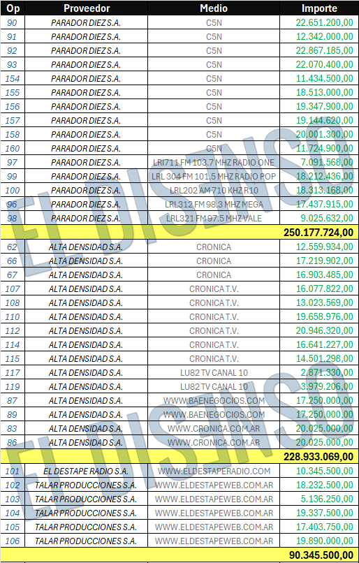 Según trascendió en una investigación de EL DISENSO, entre los principales beneficiarios de la pauta oficial se encuentran medios reconocidos por su afinidad con el gobierno anterior. Parador Diez SA, que engloba a C5N y radios relacionadas, recibió la mayor porción con $250.177.724. Le sigue el Grupo Crónica con $228.933.069 y El Destape, dirigido por Roberto Navarro, con $90.345.500.