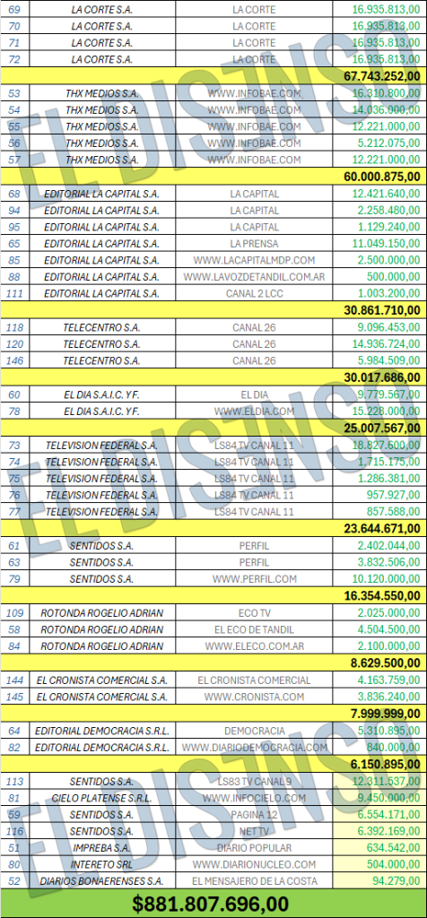 Asimismo, otros medios que figuran entre los receptores de importantes sumas son: Infobae con $60.000.875, Editorial La Capital SA con $30.861.710, Canal 26 con $30.017.686, El Día con $25.007.567, Televisión Federal SA, Canal 11, con $23.644.671, Perfil con $16.354.550, Canal 9 con $12.311.537, InfoCielo con $9.450.000, Rogelio Adrián Rotonda, El Eco de Tandil, con $8.629.500, El Cronista Comercial con $7.999.999, Pagina 12 con $6.554.542, Net TV con $6.392.169, Editorial Democracia con $6.150.895, Diario Popular con $634.542, Diario Núcleo con $504.000 y finalmente El Mensajero de la Costa con $94.279.