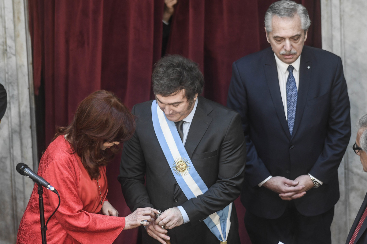 Asunción presidencial en el congreso de la nación Cristina Fernández de Kirchner le toma juramento a Victoria Villarruel Javier Milei y Alberto Fernandez Argentina Foto Federico Lopez Claro