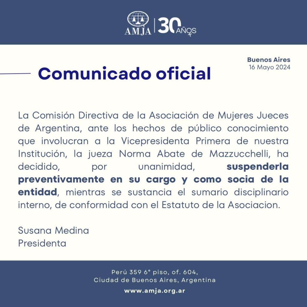“La Comisión Directiva de la Asociación de Mujeres Jueces de Argentina, ante los hechos de público conocimiento que involucran a la vicepresidente primera de nuestra institución, Norma Abate de Mazzucchelli, ha decidido por unanimidad suspenderla preventivamente en su cargo y como socia de la entidad, mientras se sustancia el sumario disciplinario interno, de conformidad con el estatuto de la asociación”, señalaron a través de un comunicado desde la entidad jurídica.