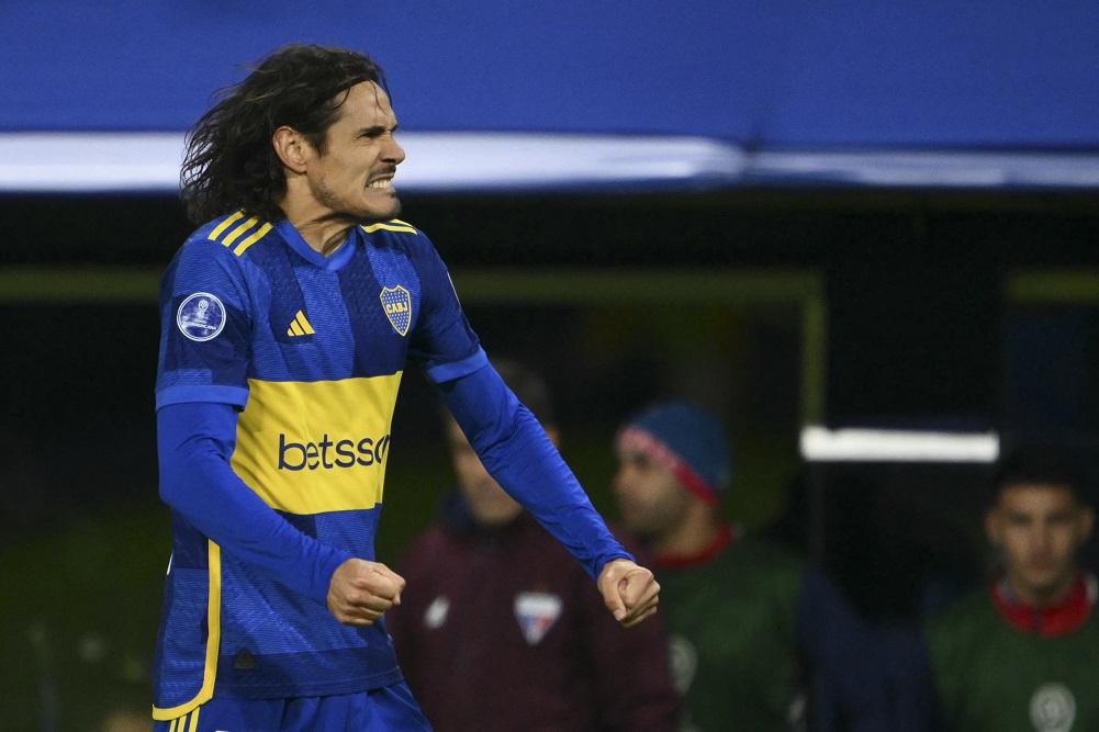 Boca Juniors' Uruguayan forward Edinson Cavani celebrates after scoring during the Copa Sudamericana group stage second leg football match between Argentina's Boca Juniors and Brazil's Fortaleza at La Bombonera stadium in Buenos Aires on May 15, 2024. (Photo by Luis ROBAYO / AFP) (Photo by LUIS ROBAYO/AFP via Getty Images)