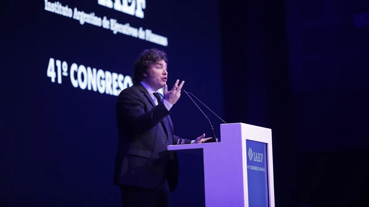 En el marco del 41º Congreso del Instituto Argentino de Ejecutivos de Finanzas (IAEF), Javier Milei presentó un programa económico que definió como “modelo de dolarización endógena”, el cual forma parte de su propuesta de Gobierno. Además, en su discurso, tomó la oportunidad para destacar el trabajo realizado por el ministro Luis Caputo en el marco de su gestión.