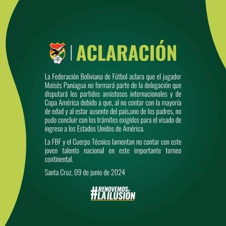 “La Federación Boliviana de Fútbol aclara que el jugador Moisés Paniagua no formara parte de la delegación que disputará los amistosos internacionales y de Copa América debido a que, al no contar con la mayoría de edad y al estar ausente del país uno de los padres, no pudo concluir con los trámites exigidos para el visado de ingreso a los Estados Unidos de América. La FBF y el Cuerpo Técnico lamentan no contar con este joven talento nacional en este importante torneo continental”, fue el comunicado de la FBF.