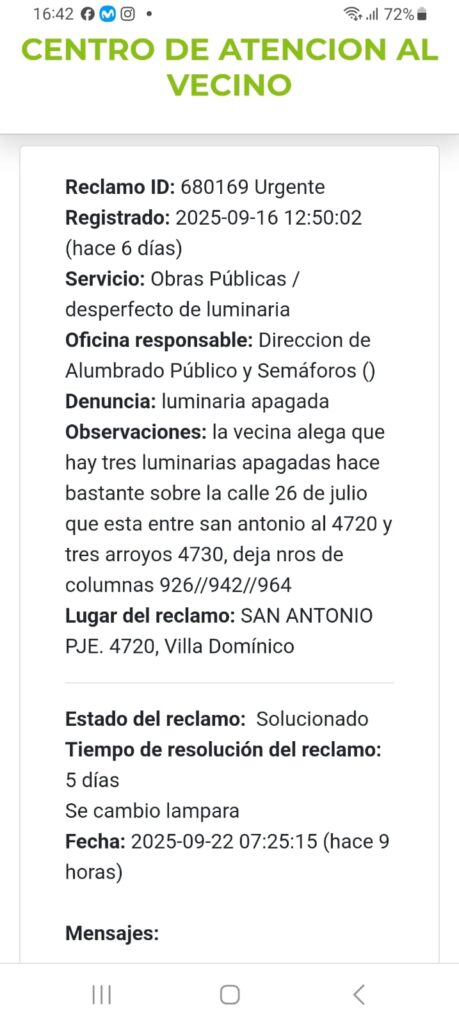 El reclamo fue registrado en el Centro de Atención al Vecino con fecha 16 de septiembre de 2025, bajo el número 680.169, y estaba clasificado como urgente. La oficina responsable de Alumbrado Público figura como responsable, y el tiempo estimado de resolución era de cinco días. Sin embargo, la falta de control y seguimiento genera que los problemas persistan, dejando a los residentes en riesgo cada noche.