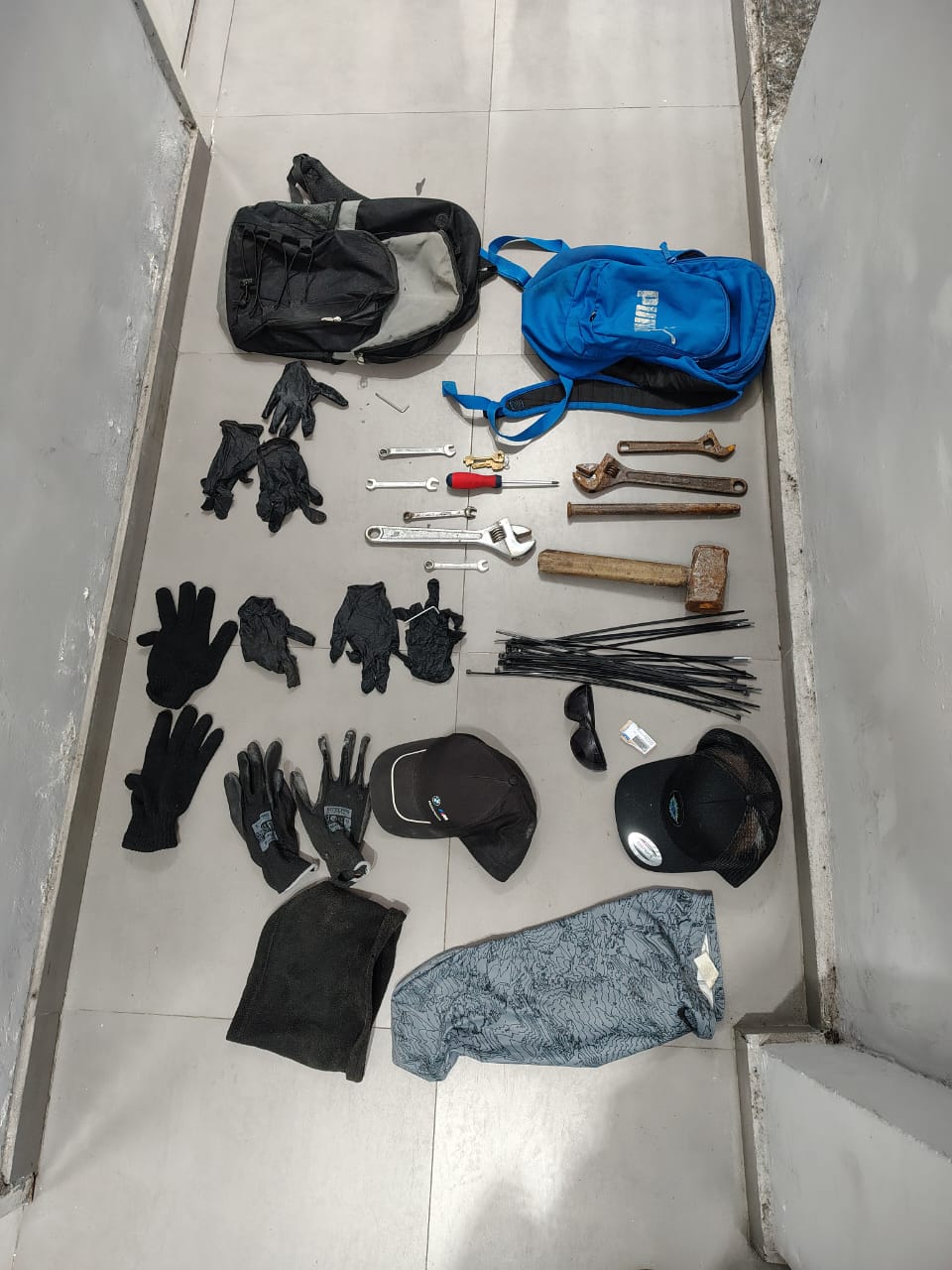 Al notar la presencia policial, los jóvenes dejaron dos mochilas debajo de vehículos en la calle Giribone y San Luis. Pero no era cualquier mochila: adentro había herramientas varias, precintos y guantes, como para preparar sus choreos. La maniobra no les sirvió de nada: la policía los identificó y empezó la persecución.