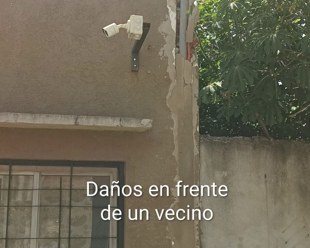 Según relatan los vecinos, en una de las maniobras el camión directamente arrancó el cableado del frente, provocando daños visibles en la estructura de la casa afectada. Las imágenes remitidas a este medio muestran claramente cómo quedó el frente tras el impacto.