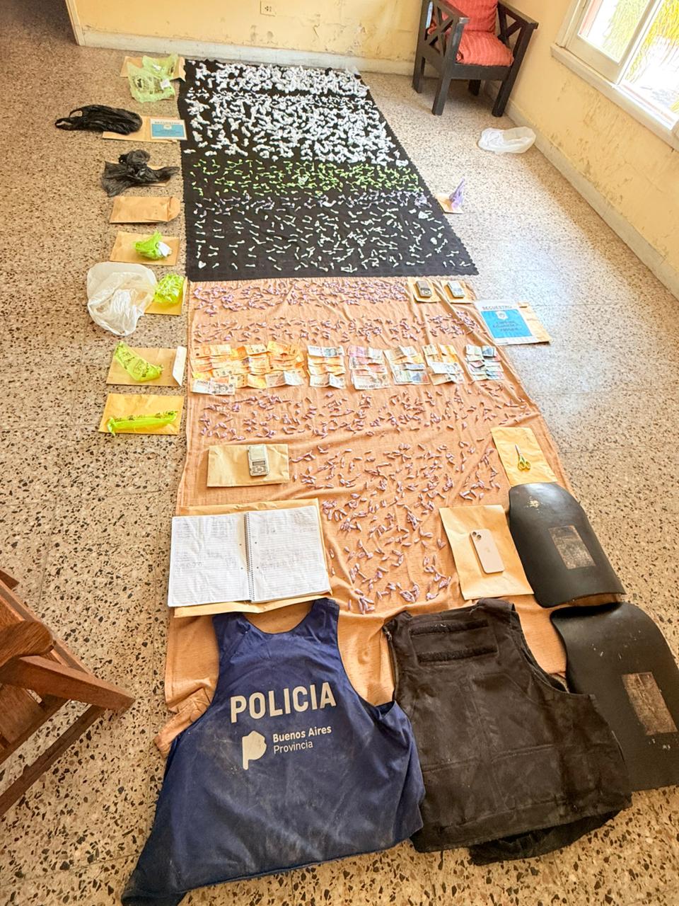 Durante los procedimientos se logró el secuestro de un importante volumen de material vinculado al narcomenudeo, entre ellos 1.770 envoltorios de clorhidrato de cocaína y 457 envoltorios de marihuana, además de tres balanzas de precisión, elementos utilizados para el corte y fraccionamiento de la droga, dinero en efectivo, un cuaderno con anotaciones de presunta venta de estupefacientes y un teléfono celular. También se incautaron dos chalecos antibalas, uno perteneciente a la Policía de la Provincia de Buenos Aires con pedido de secuestro activo, y otro chaleco rígido con numeración de serie suprimida, lo que refuerza la gravedad del entramado delictivo investigado.