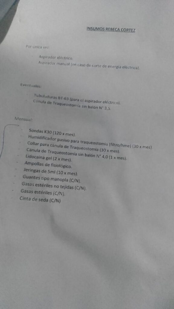 Entre lo más necesario se encuentran una sonda nasogástrica K30, PAF Fluticasona 125 y, de manera prioritaria, leche maternizada etapa 2, fundamental para su alimentación y desarrollo. El costo de esta leche es muy elevado y resulta imposible de afrontar sin ayuda.