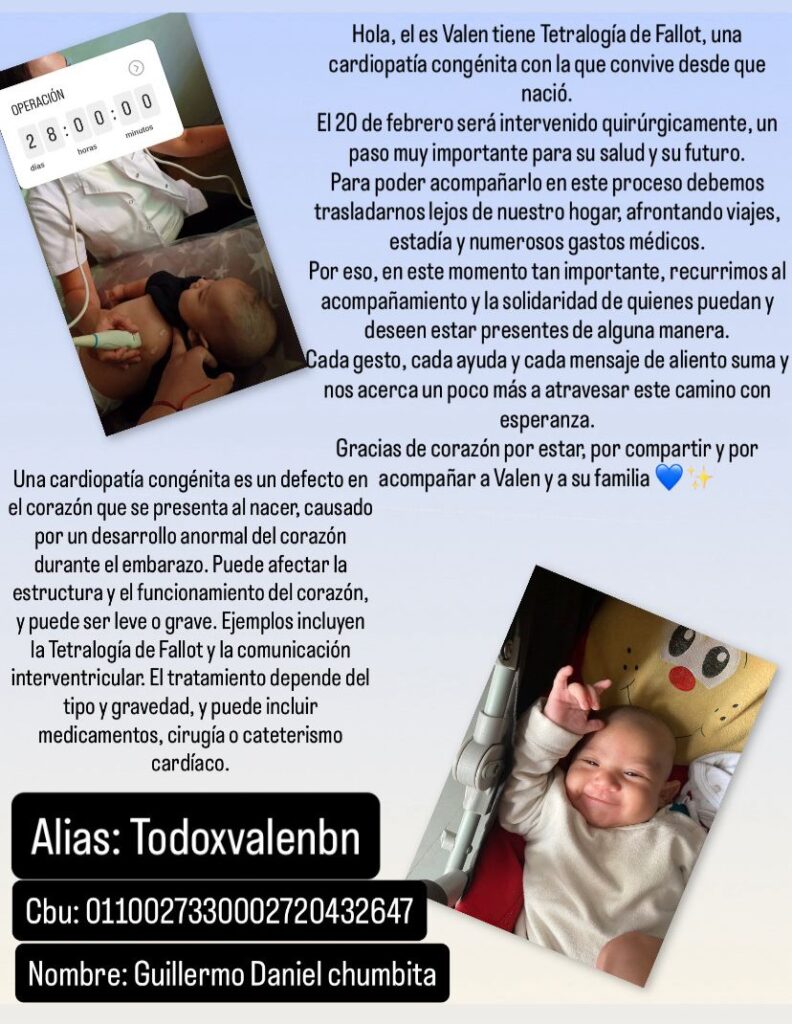 — El proceso es complejo. Durante la intervención y el postoperatorio, Valentino estará internado en la Unidad Coronaria Intensiva Neonatal. El cirujano fue muy claro: debemos permanecer cerca del hospital para una respuesta rápida ante cualquier eventualidad. “Una vez que él pase a sala común yo podría estar con él internada, pero bueno, después del alta sería volver a pagar un alquiler semanal para poder estar cerca como nos indican…”, nos cuenta Agustina con preocupación, ya que el seguimiento médico post-cirugía es igual de crítico.