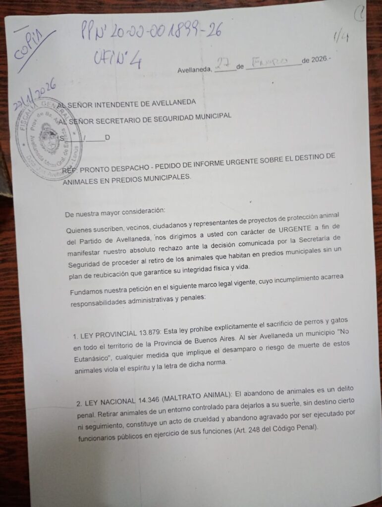 Bajo el número de expediente PPN 20-00-001899-26, los denunciantes lograron ingresar por mesa de entrada un pedido de Pronto Despacho dirigido tanto al Intendente como al Secretario de Seguridad Municipal. El texto es una pieza legal contundente que denuncia el retiro de animales de predios municipales sin un plan de reubicación que garantice su vida.