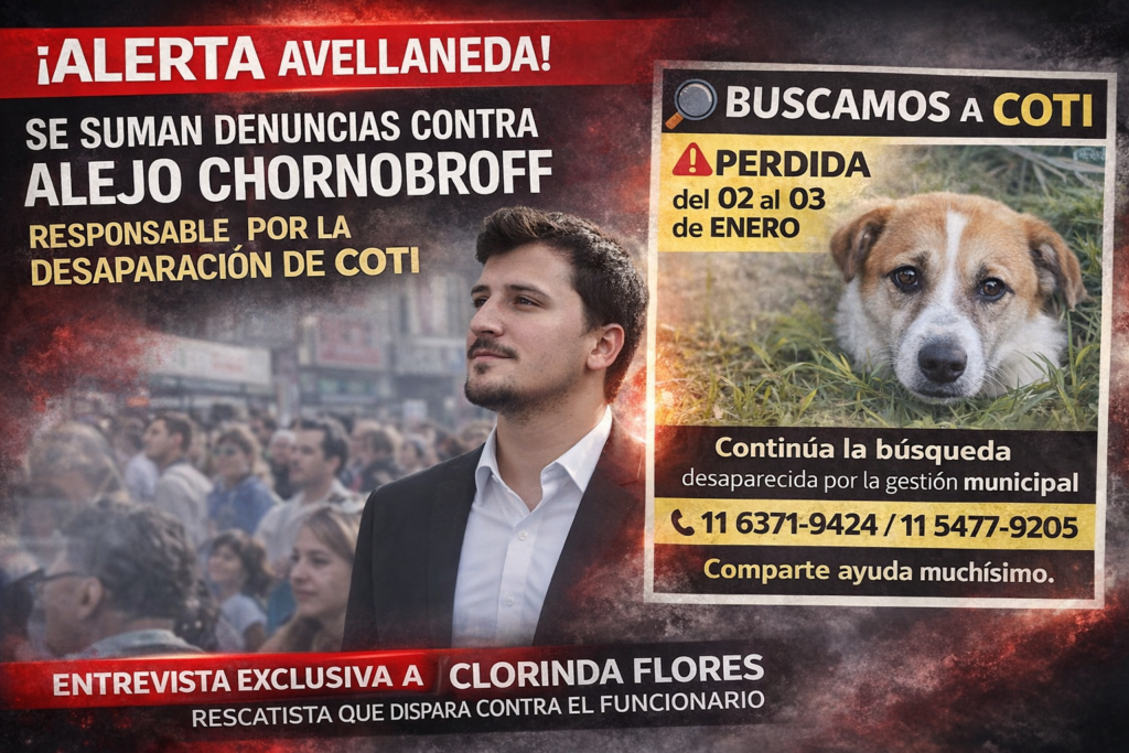 La indignación en Avellaneda crece a medida que pasan las horas y la perrita Coti sigue sin aparecer. Tras la movilización al Polo Judicial, el foco de la tormenta se posa sobre Alejo Chornobroff, señalado como el responsable político de un plan de retiro forzado de animales que la comunidad califica de “exterminio”.