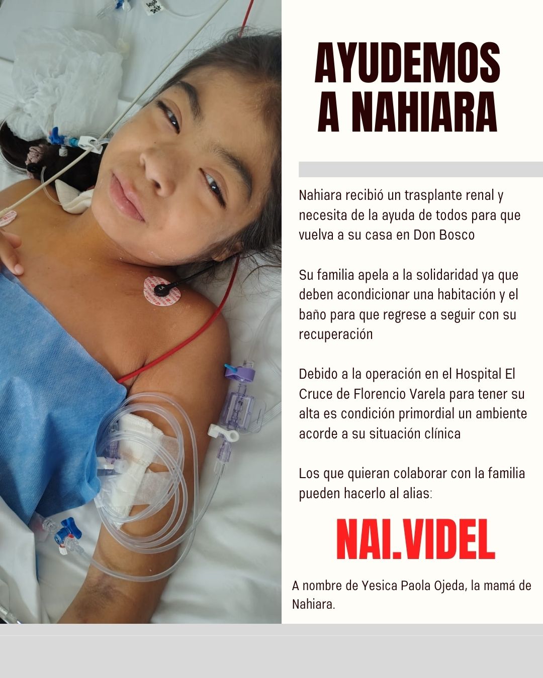 Nahiara Gómez recibió la semana pasada un trasplante renal en el Hospital El Cruce de Florencio Varela, se recupera favorablemente y para recibir el alta su familia necesita acondicionar su habitación y el baño de la vivienda en Don Bosco; como también levantar el piso por la humedad que afectaría su cuadro clínico. Es una condición esencial para que continúe su recuperación, por tal motivo, su mamá Yésica apela a la solidaridad de quienes puedan ayudar a esta familia y mejorar la calidad de vida de Nahiara.