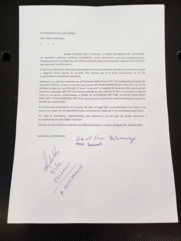 AVELLANEDA, MARZO 2026. Lo que comenzó como una lucha por un ambiente sano en Sarandí terminó en una tragedia humanitaria para una familia histórica del barrio. María Ducomls y Daniel Retamoza le enviaron una carta desesperada al Intendente de Avellaneda, Jorge Ferraresi, solicitando su intervención inmediata tras haber sido desalojados de su vivienda en Camino de la Costa y Sargento Ponce (Quinta 41), casa que luego fue demolida.